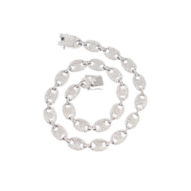 Deixe-se seduzir pela elegância gelada da corrente "Silver Coffee", uma peça emblemática com design sofisticado e audacioso. Com seus elos largos totalmente cravejados de strass brilhantes, ela redefine os códigos do estilo urbano com finesse e potência.